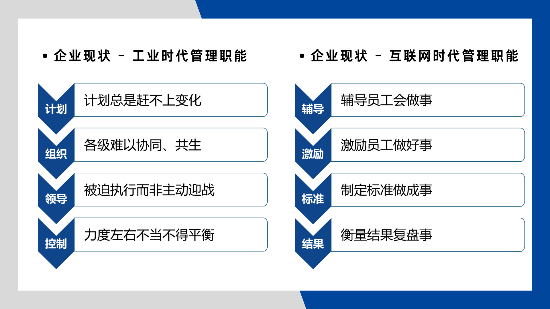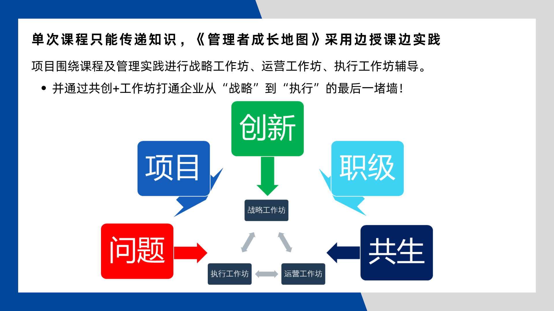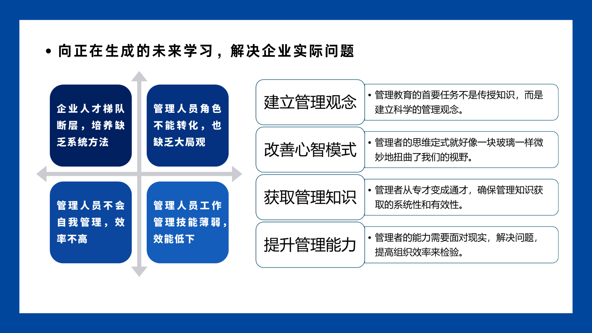 在一個信息、知識爆炸的年代,大家想獲得知識很便捷,甚至很多企業(yè)的管理者學(xué)了大量的課程,對通用類課程已經(jīng)提不起興趣,更別提去實踐和運用,再有也正是很多管理人員學(xué)了很多課程,大家認知的不同,導(dǎo)致青睞的工具、流程不同,這很可怕,就相當于發(fā)動機與變速箱不協(xié)調(diào),車子怎么跑得起來。