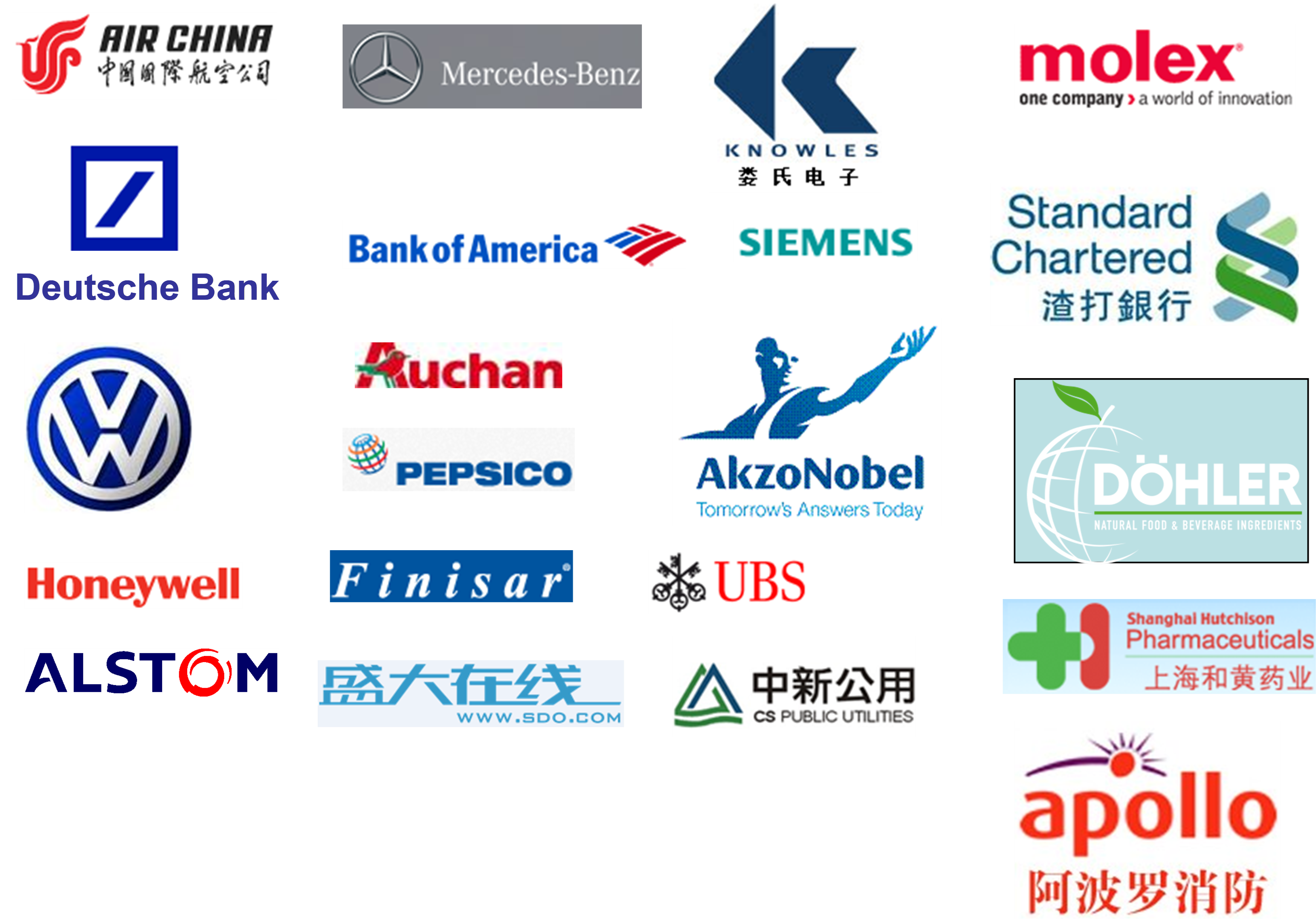 中煤集團(tuán),中通客車,紅獅水泥,一汽轎車,一汽大眾,三星,沃爾沃,中國(guó)電力投資集團(tuán)公司,中國(guó)華電工程有限公司,中國(guó)國(guó)際航空公司,新加坡國(guó)際企業(yè)發(fā)展局,新加坡經(jīng)濟(jì)發(fā)展局,新加坡媒體管理局,德勤會(huì)計(jì)師事務(wù)所,德意志銀行,渣打銀行,美國(guó)銀行,律師事務(wù)所,新加坡勝科環(huán)保企業(yè),新加坡科技企業(yè),路透社, 大眾汽車(北京),奔馳汽車,阿克蘇諾貝爾(東莞),百事可樂(lè) (廣州),安德里茲(佛山),歐尚,豪邁,婁氏電子,山東鋼鐵公司,中新公用集團(tuán)(蘇州),菲尼薩(上海),德樂(lè)(上海),島津企業(yè),采埃孚長(zhǎng)春公司,晉煤天溪煤制油公司,Fastco上海公司,中芯國(guó)際(上海)有限公司,上海亞?wèn)|國(guó)際貨運(yùn),太倉(cāng)國(guó)際(蘇州),聯(lián)合汽車電子有限公司(重慶),中國(guó)人壽上海市分公司,上海銳畢利機(jī)電科技有限公司,普洛斯投資管理(中國(guó))有限公司,南昌大學(xué)EMBA總裁班,清華大學(xué)博士班,和黃藥業(yè),修正藥業(yè),北京排水集團(tuán)污水處理廠等等。